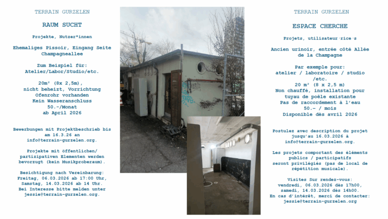 Februar 2026: Ausschreibung freier Raum 20m ehemaliges Pissoir. Und Mitbewohner:in gesucht in Atelierraum Jenga Pavillon.