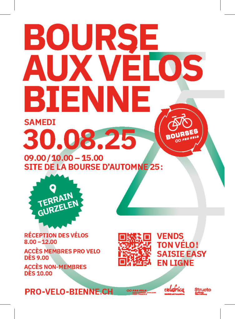 La populaire bourse aux vélos de Bienne aura lieu pour la première fois le 30 août sur le terrain de la Gurzelen – en même temps que le 2e BienneCrit Velokriterium. Toutes les infos sur le site de PRO VELO Biel/Bienne – Seeland – Jura bernois.