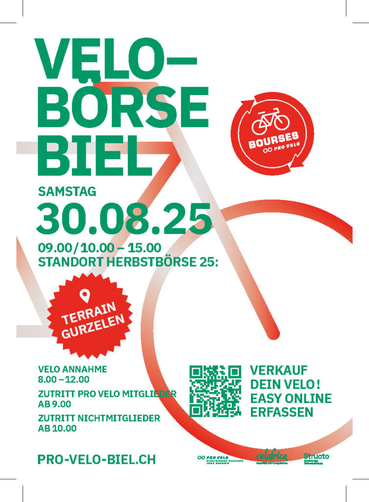 Die beliebte Bieler Velobörse findet am 30. August zum ersten Mal auf dem Terrain Gurzelen statt – gleichzeitig mit dem 2. BienneCrit Velokriterium. Alle Infos auf der Website von PRO VELO Biel/Bienne – Seeland – Jura bernois.
